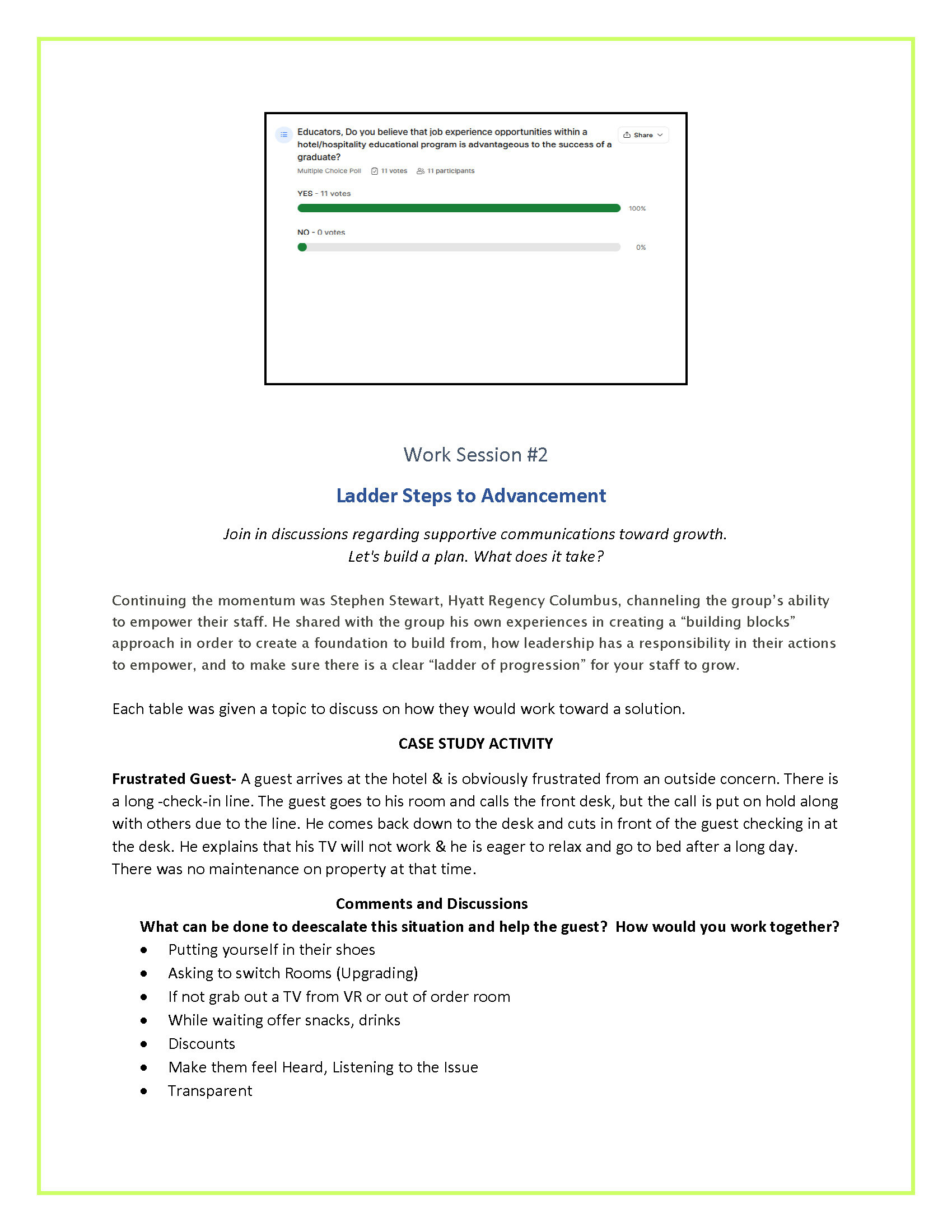 The Future of Lodging Summit succeeded in its goal with an attendance of 120 interested attendees in the hospitality industry’s education & workforce issues of our current times and looking to the future of the industry. A mix of sessions, panels and presenters, including several HANDS-ON Activities helped the audience say what was needed by each sector of attendees